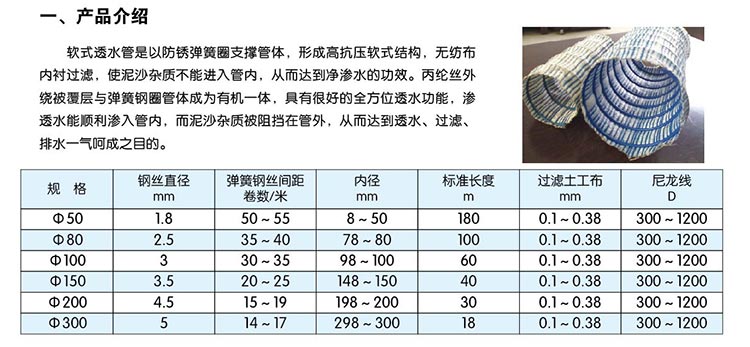 透水管是以防銹彈簧圈支撐管體,形成高抗壓軟式結(jié)構(gòu),無紡布內(nèi)襯過濾,使泥砂雜質(zhì)不能進入管內(nèi),從而達到凈滲水的功能。滌綸絲外繞祉覆層具有優(yōu)良吸水性,能迅速收集土體中多余水份。橡膠筋使管壁被覆層與彈簧鋼圈管體成為有機一體,具有很好的透水功能,滲透水順利滲入管內(nèi),而泥砂雜質(zhì)被阻擋在管外,從而達到透水、過濾、排水一氣呵成之目的。