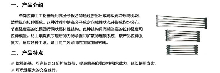 單向拉伸的土工格柵是由高分子聚合物經(jīng)擠出壓成薄板再沖規(guī)則孔網(wǎng),然后縱向拉伸而成。這種過程中使高分子成定向線性狀態(tài)并形成分布均勻、節(jié)點強度高的長 橢圓形網(wǎng)狀整體性結(jié)構(gòu)。此種結(jié)構(gòu)具有相當(dāng)高的拉伸強度和拉伸模量,特別是我公司此類產(chǎn)品更具有超國際水平的高早期(伸長率在2%—5%)拉伸強度和拉伸模 量。給土壤提供了理想的力的承擔(dān)和擴散的連鎖系統(tǒng)。該產(chǎn)品拉伸強度大(>150Mpa),適應(yīng)各種土壤,是目前廣為采用的加筋加固材料。